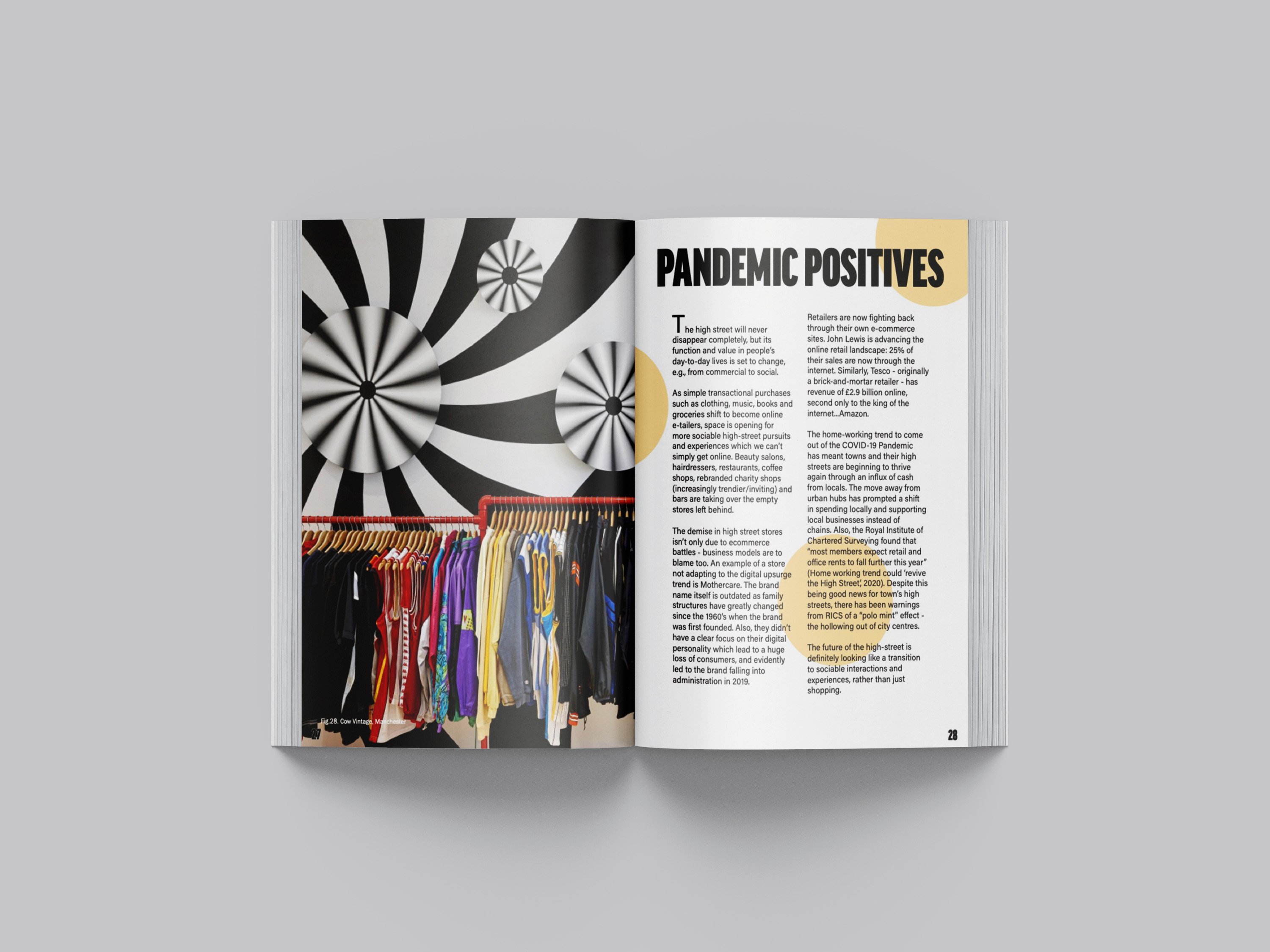 With a focus on sustainability within the fashion industry, by refining my interests alongside an analysis of growing trends, I identified a growing trend of the glamorisation of second-hand shopping. This evidently leads to the high-street being brought back to life, hence the title of my report “The Revival of the High Street” which opposes the commonly used phrase ‘the death of the high-street.’
