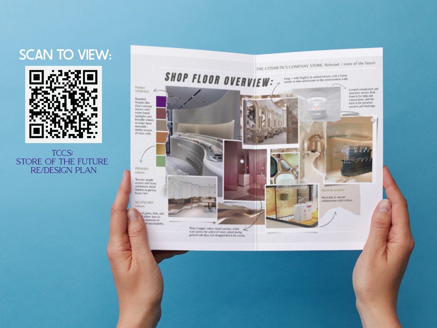 An 8-week professional industry Live Client Brief with Estee Lauder Companies to dechipher what The Cosmetic Companies’ store of the future will consist of, look like, and behave as. The final presentation was at the London head office infront of: the Store Design and Visual Merchandising Director, the Creative Operations Executive, the Visual Merchandising Design Manager, my course’s Principal Lecturer, and round 20 other students who took part in the same brief.