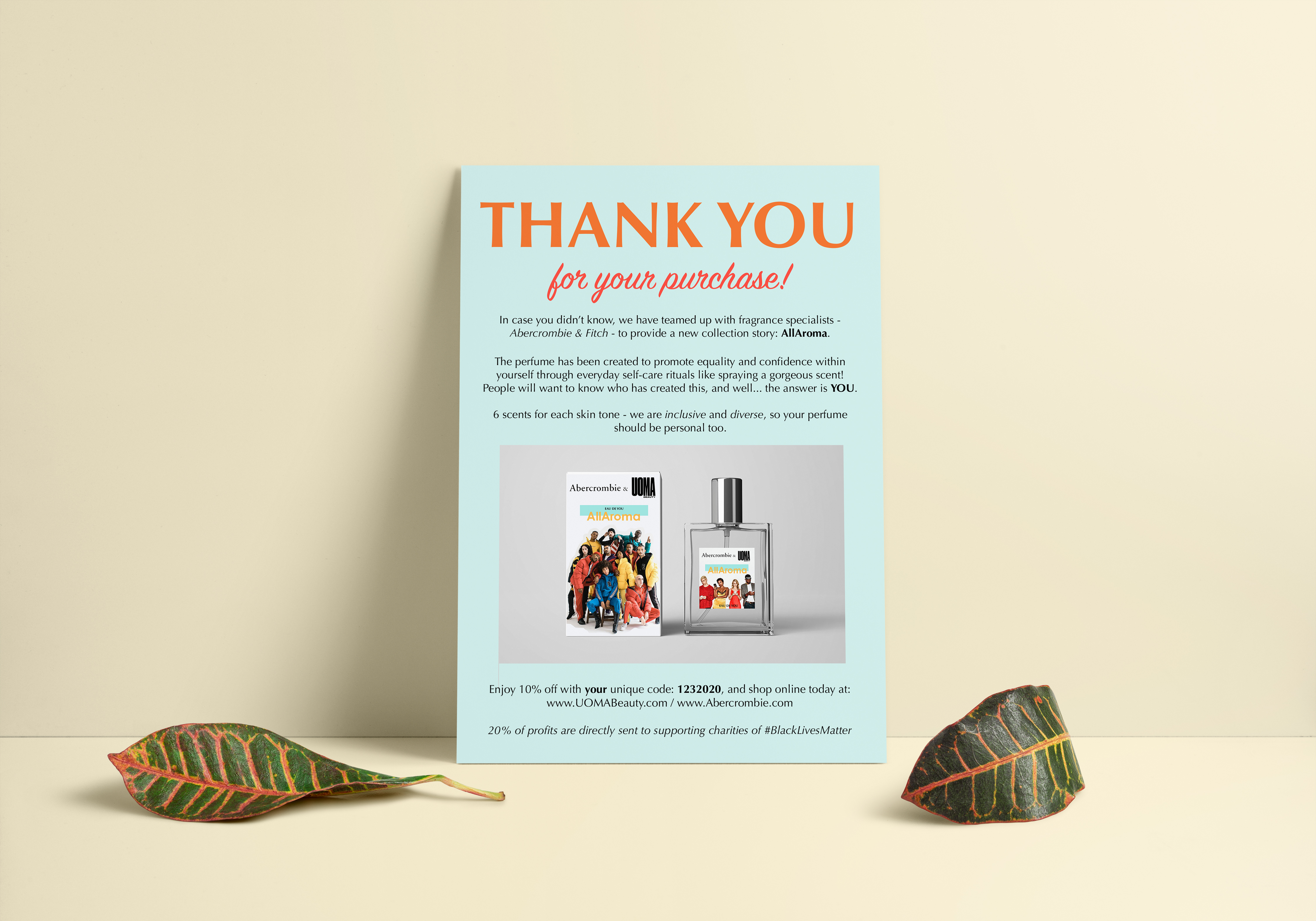 A collaboration between these brands would help UOMA gain much more exposure, whilst also sticking to the each of the brand’s aesthetics with the additional ‘collection story’: AllAroma. This fragrance collaboration will also help Abercrombie & Fitch’s new brand image, since the merging of another industry (beauty) can help the brand take a new step. The collaboration also ensures that there is a sustainable use of products and packaging, a suitability for vegans, and 20% of all profits will go to charities and funding to help the Black Lives Matter and Pride movements.
