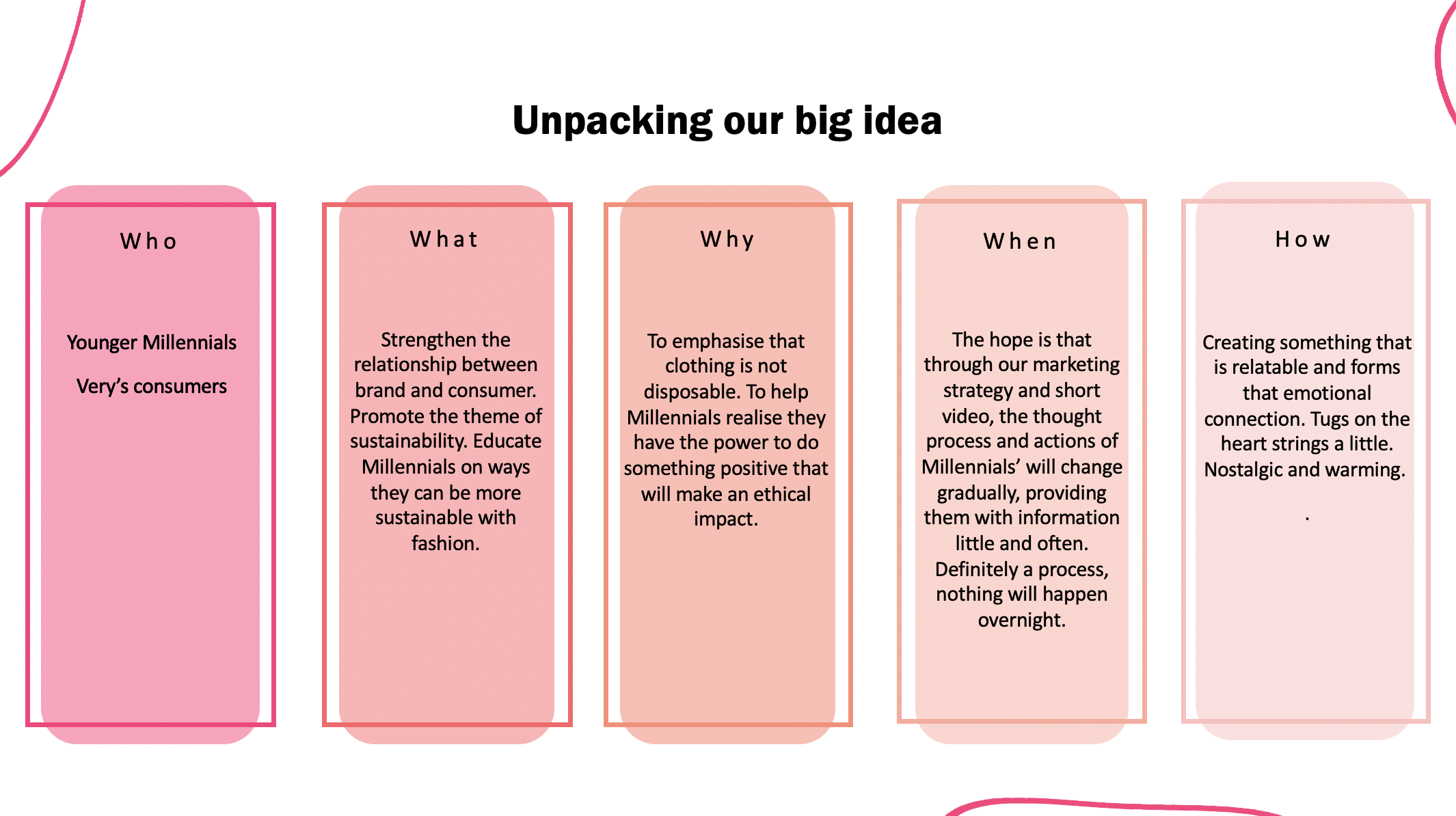 My team were given the classic film ‘Call Me By Your Name’, to watch as the starting point of our creative concept process. We were encouraged to take inspiration from the film in general, or from individual elements such as the director, stylists, actors, cinematography, or events that relate to the film.Our big idea was defined by: ‘Enhancing Very’s relationshop with their millennial consumers through creating an emotional connection, whilst promoting ethical and sustainable fashion choices.’